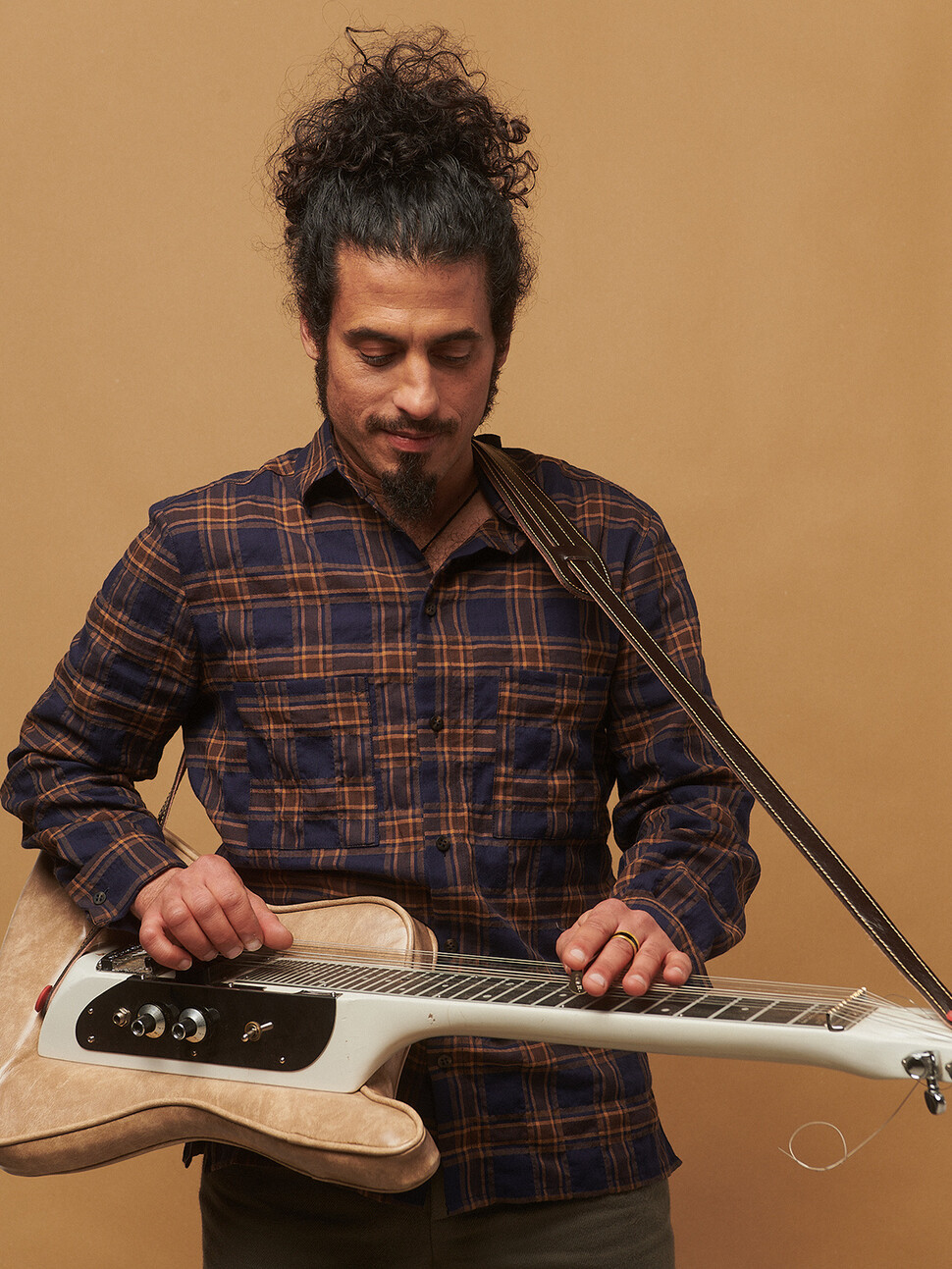 Claudia Güdel Herbst/Winter 2023-24. Leicht tailliertes Karohemd für den Mann. Der Stoff stammt aus Japan, ist leicht gecrinkelt und zu 100% aus Biobaumwolle.