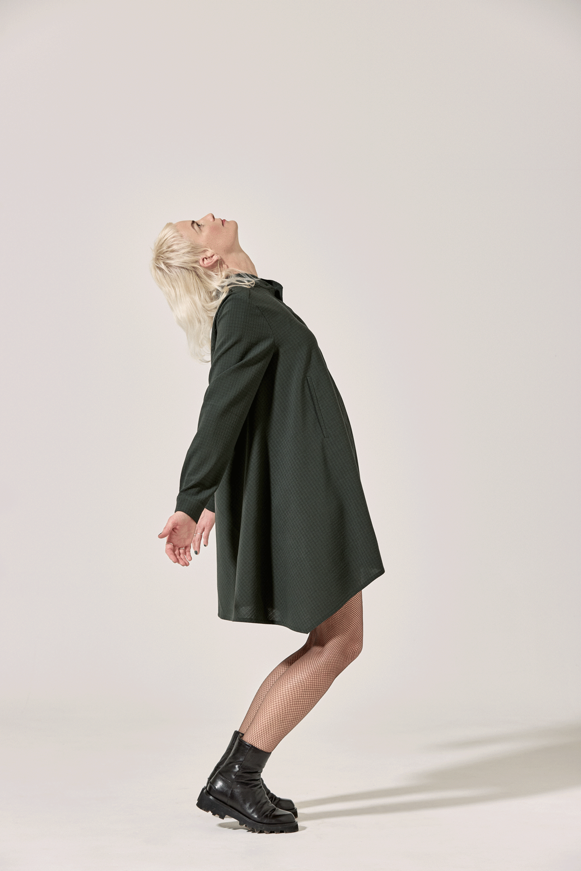 O-förmig geschnittenes Blusenkleid ohne Seitennaht, mit verdecktem Knopfverschluss, Stehkragen, zwei seitlichen Taschen und langen Ärmeln mit Manchetten. Das luftige Kleid, welches offen auch als leichte Tunika oder im Schichtenlook getragen werden kann, ist aus einem weich fallenden, knitter- sowie bügelfreien Seersuckergewebe.