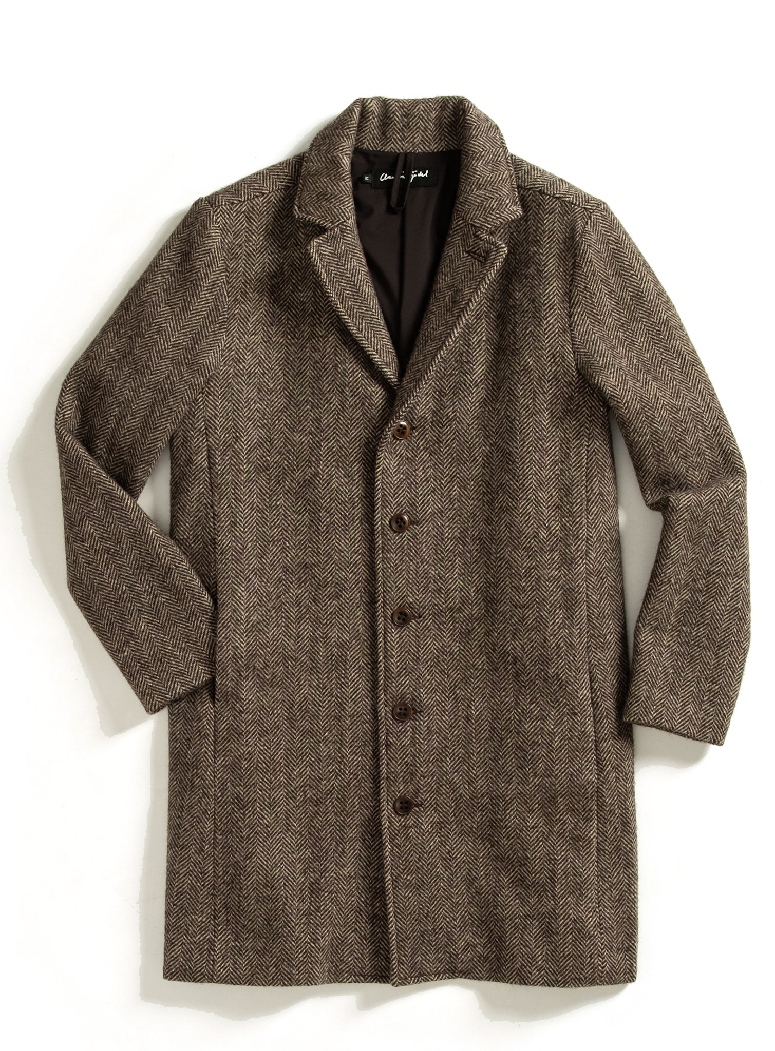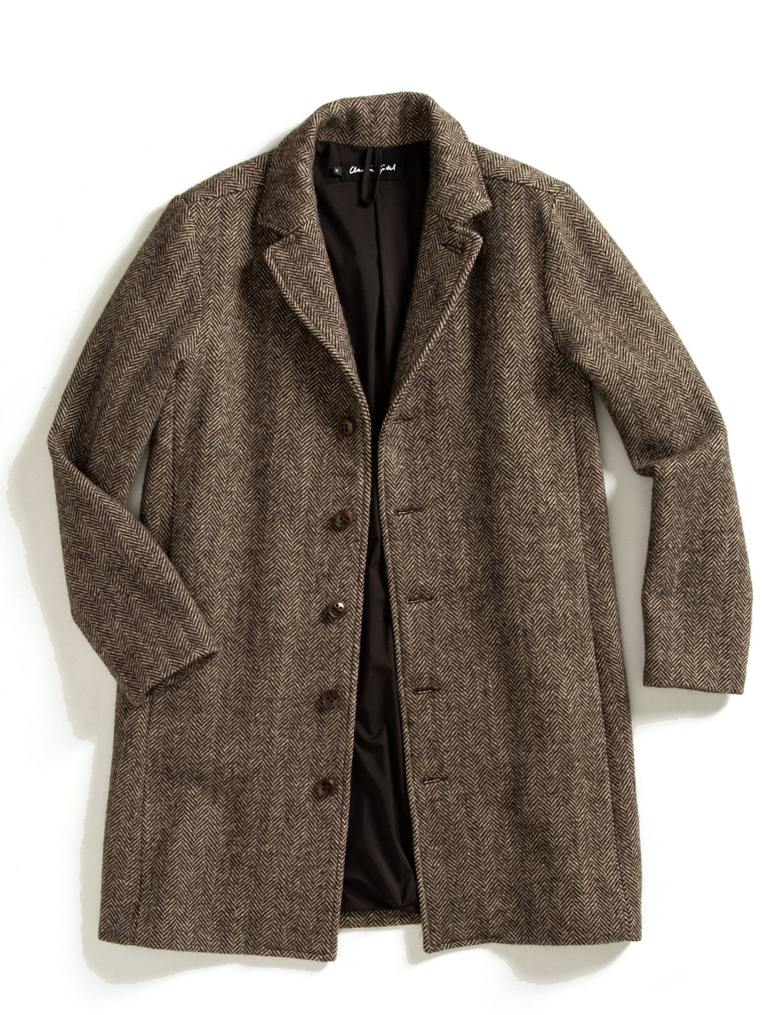 Der schöne, schlicht geschnittene Wollmantel ist aus einem weichen Fischgratgewebe, hat seitliche Taschen und ein wunderschön verarbeitetes Innenfutter mit weiteren praktischen Taschen.