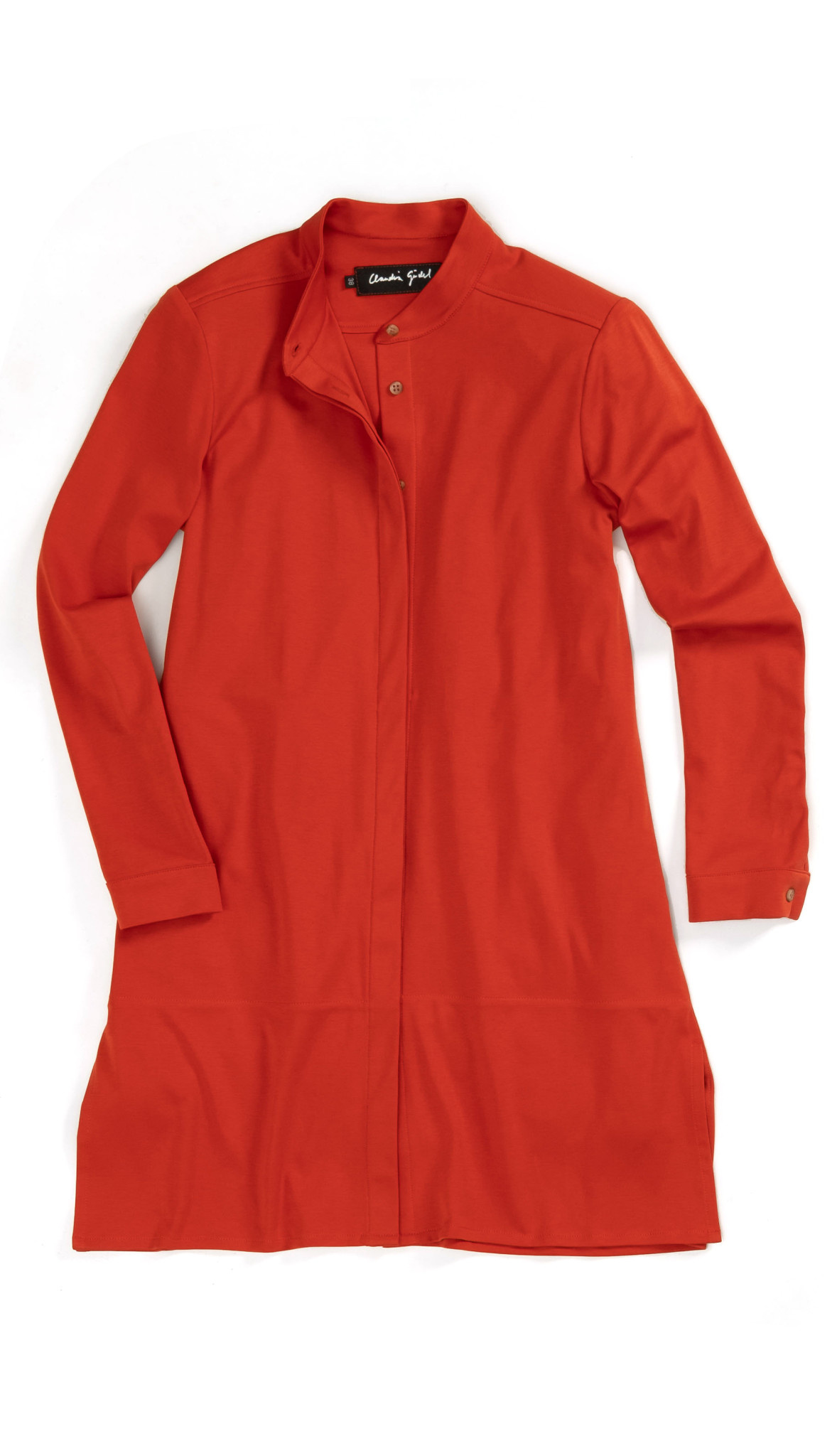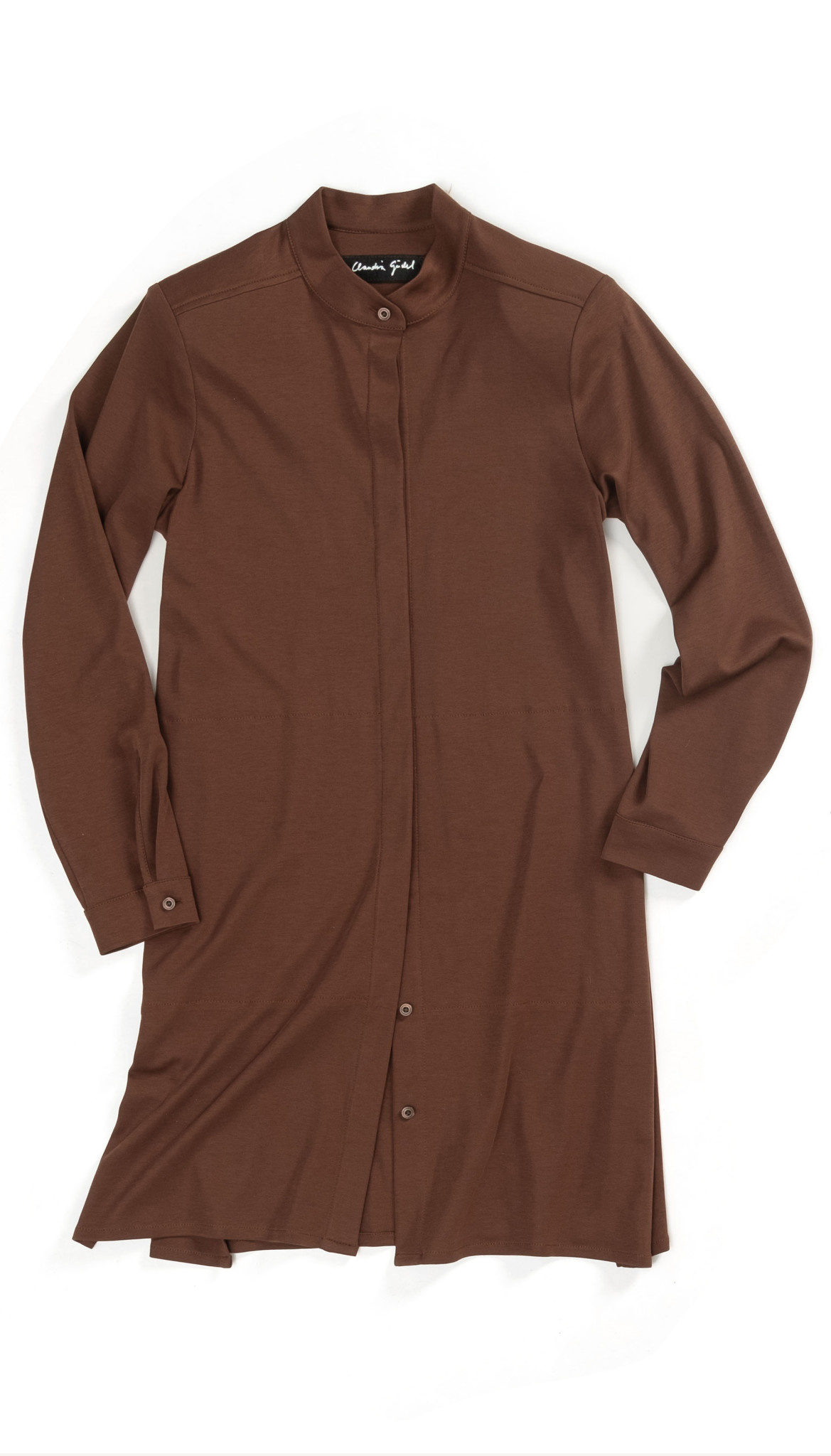 Langes Hemdkleid mit verdecktem Knopfverschluss, Manchetten und seitlichen Schlitzen aus einer kräftigen, biologisch angebauten Pima-Baumwolle. Die langstapelige Faser verleiht dem hochwertigen Kleidungssück ihren matten Glanz und die intensive Farbe. Die Tunika mit Seitentaschen kann sowohl als Kleid, wie auch zu einer Hose getragen werden, mal offen, mal geschlossen.