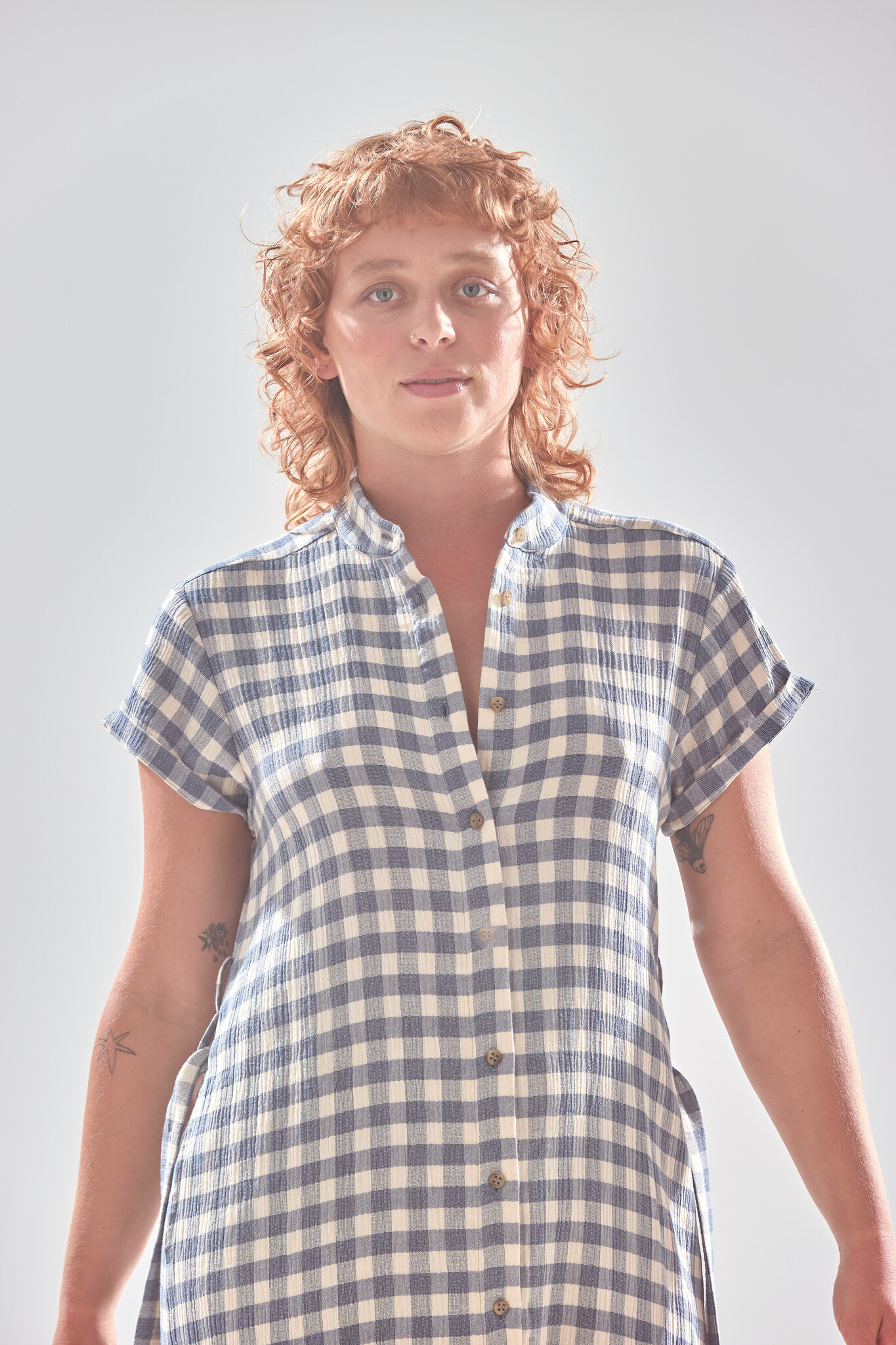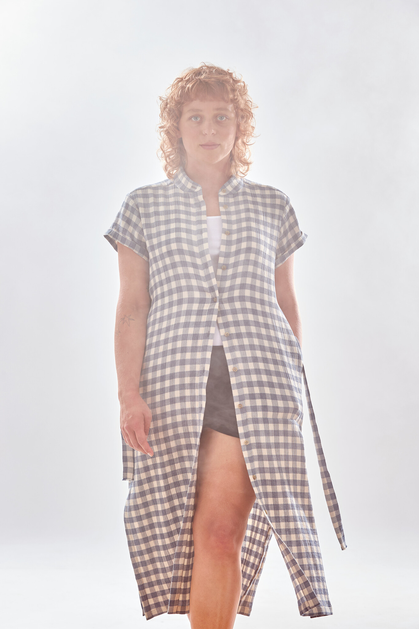 Das locker und gerade geschnittene Hemdkleid mit seitlichen Taschen und Schlitzen, Stehkragen und abnehmbarem Taillengurt reicht bis Mitte Wade und ist aus einem angenehm weichen und wunderschön fallenden Baumwoll-Musselin im Karo Look. Mit diesem gleichermassen schönen wie schlichten Sommerkleid kommt Frau garantiert wunderbar leicht und elegant durch die warmen Sommertage.