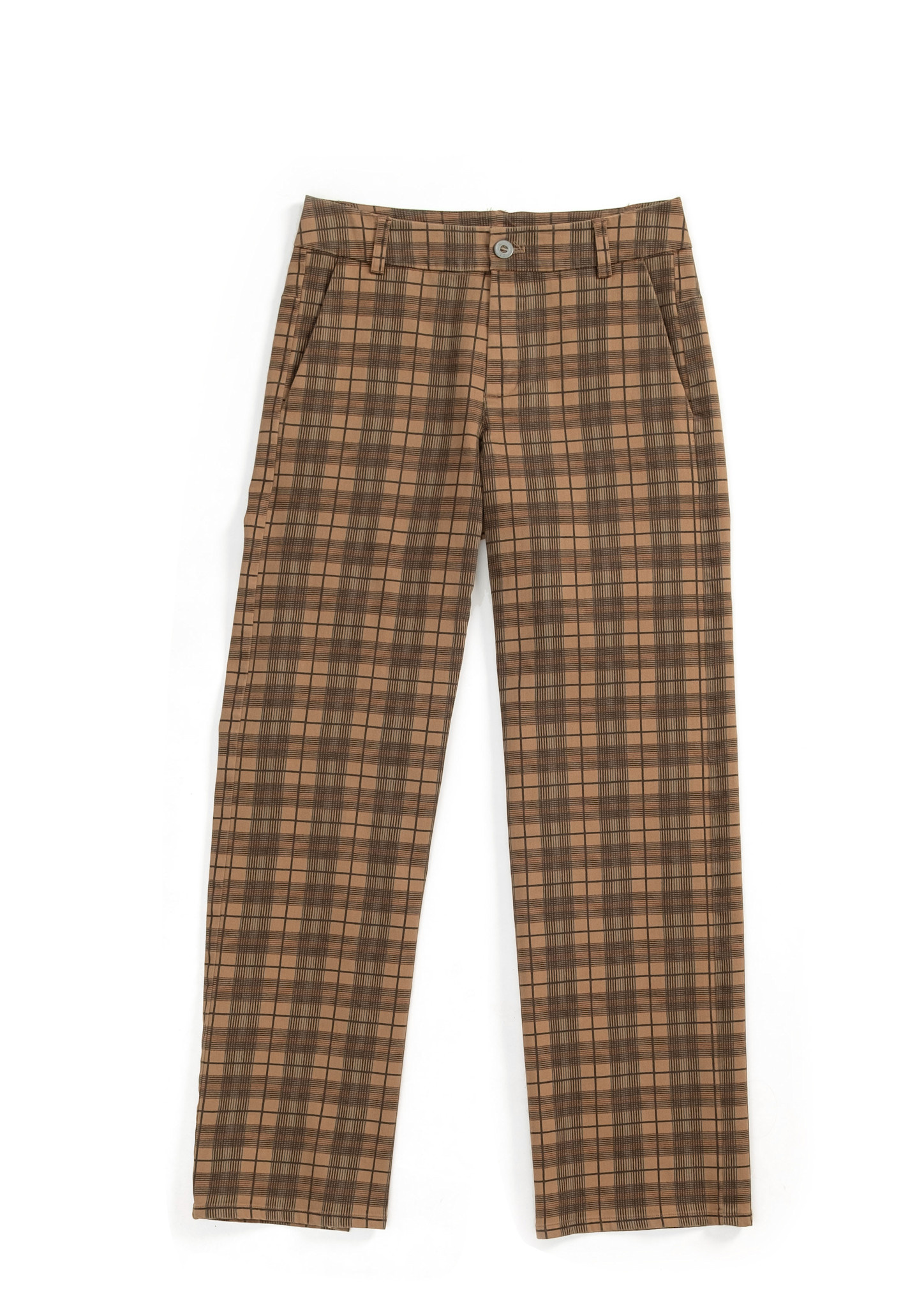 • Weit geschnittene Unisex Hose mit geradem, langem Bein und je zwei Taschen hinten und vorne aus unserem bewährten, leichten und anschmiegsamen Jeansgewebe mit Karodruck.