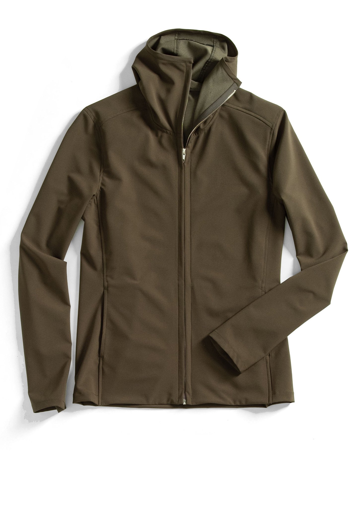 Leicht taillierte Jacke mit verdecktem Reissverschluss vorne, hoher Kapuze, abgeschrägten Ärmelabschlüssen, zwei seitlichen Taschen in der Naht und zwei Innentaschen. Der Hoody im leichten DrySkin Funktionsmaterial von Rotofil (CH) ist Pulli wie Jacke, atmungsaktiv und zugleich wind- und wasserabweisend.