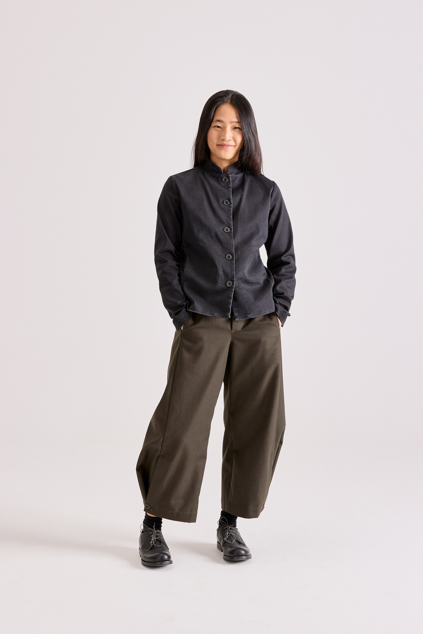 Die schlichte, ungefütterte Kurzjacke für die Frau mit Stehkragen, Seiten- und Innentaschen aus einem weichen, elastischen Baumwollgewebe ist Jacke, Blazer und Blouson zugleich und somit für jede tägliche Herausforderung einsetzbar. Die Jacke kann zudem mit der passenden Hose als Anzug getragen werden.