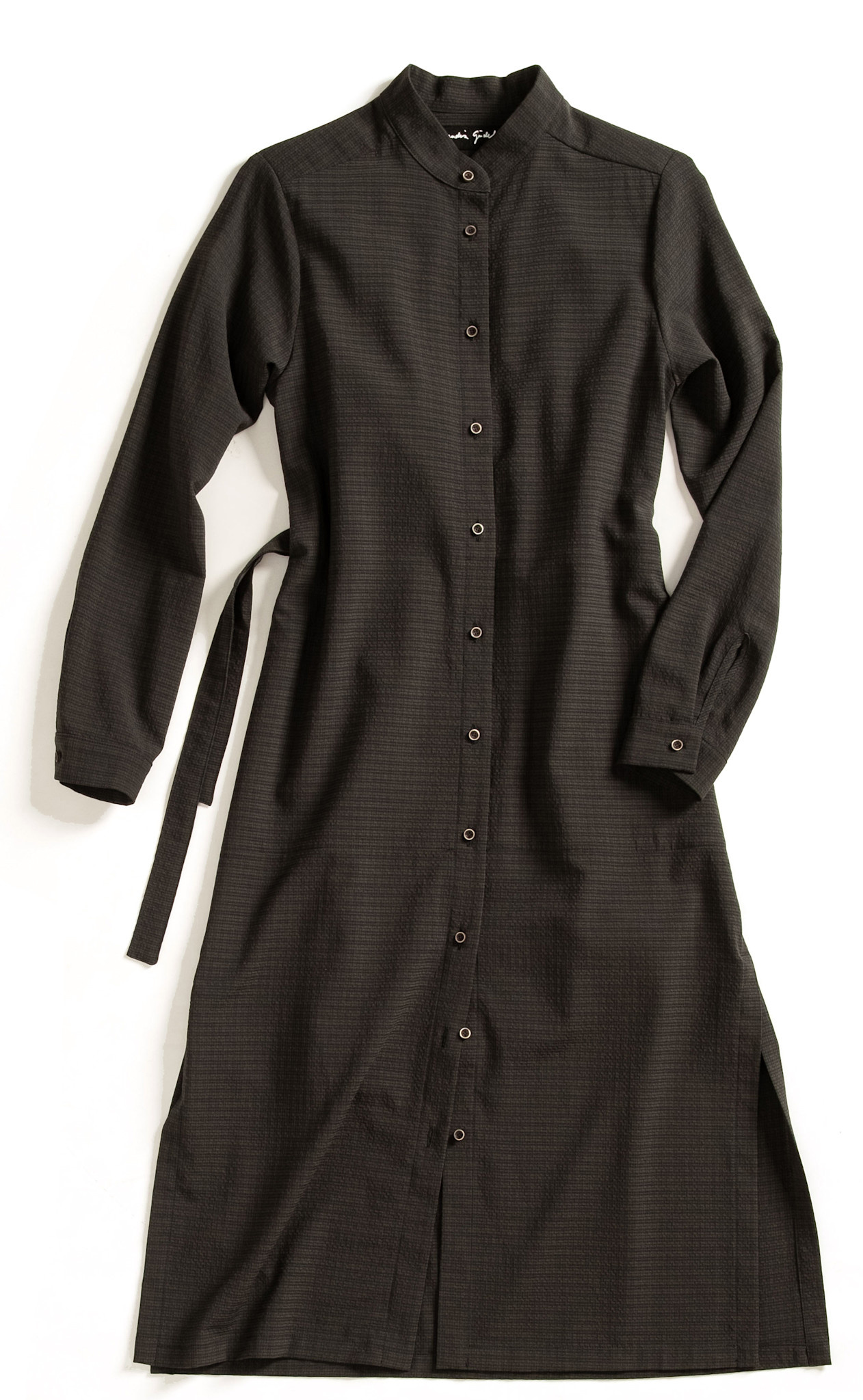 Das locker und gerade geschnittene Hemdkleid mit seitlichen Taschen und Schlitzen, Stehkragen und abnehmbarem Taillengurt reicht bis Mitte Wade und ist aus einem weich fallenden, knitter- sowie bügelfreien Seersuckergewebe mit Wolle. Das gleichermassen elegante und unkomplizierte Kleid kommt je nach Styling ganz alltäglich sowie auch super chic zur Geltung.