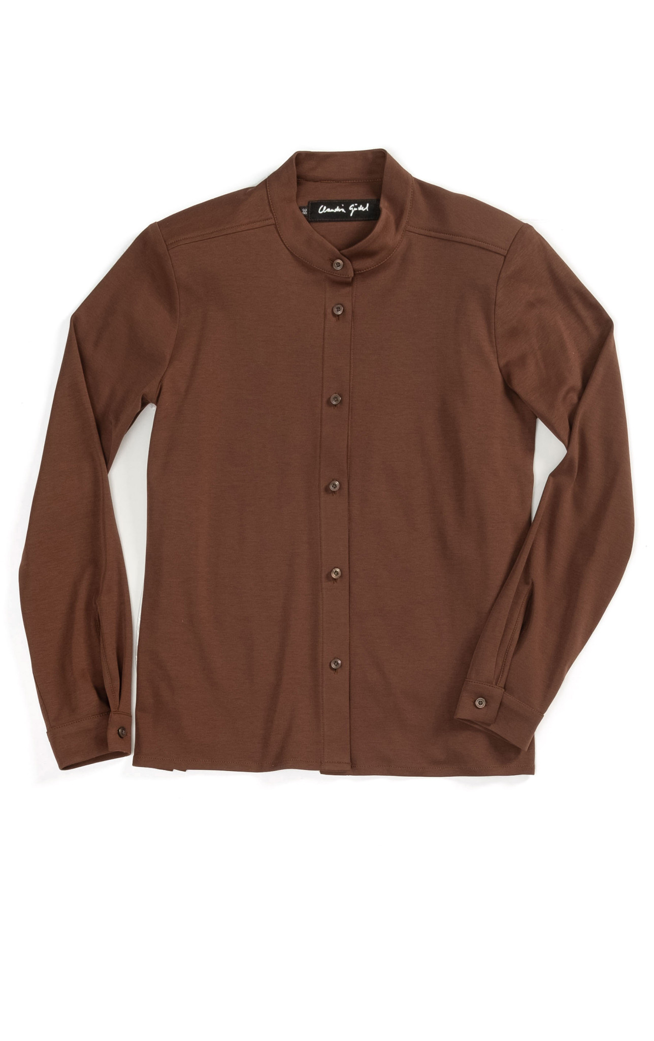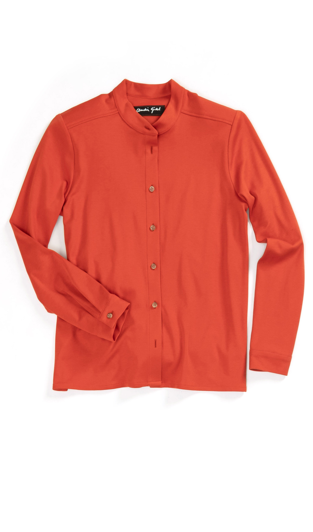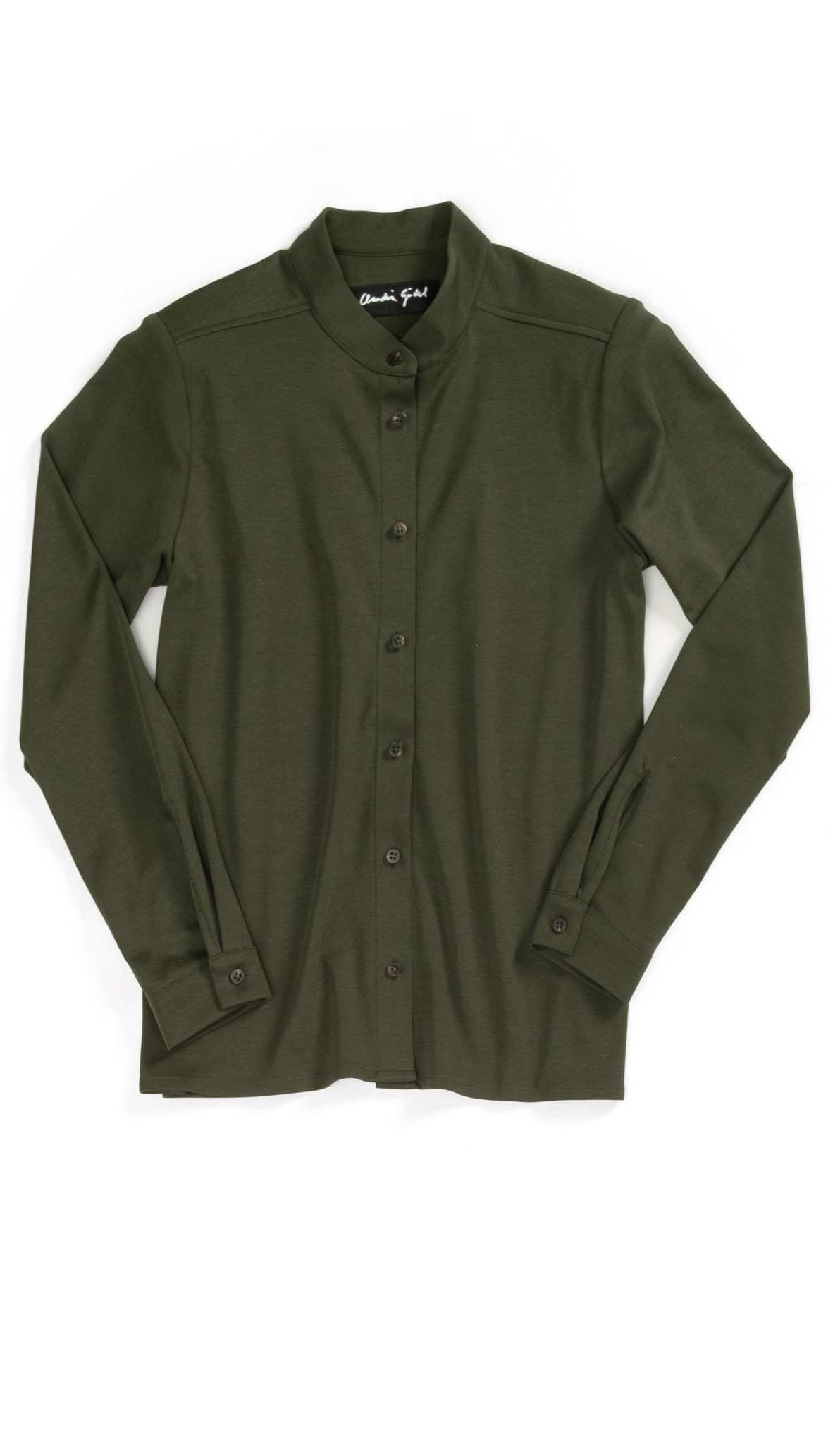 Eine schlichte, auf das Minimum reduzierte Stehkragenbluse für die Frau, aus einer kräftigen, biologisch angebauten Pima-Baumwolle. Die langstapelige Faser verleiht dem hochwertigen Kleidungssück ihren matten Glanz und die intensive Farbe.