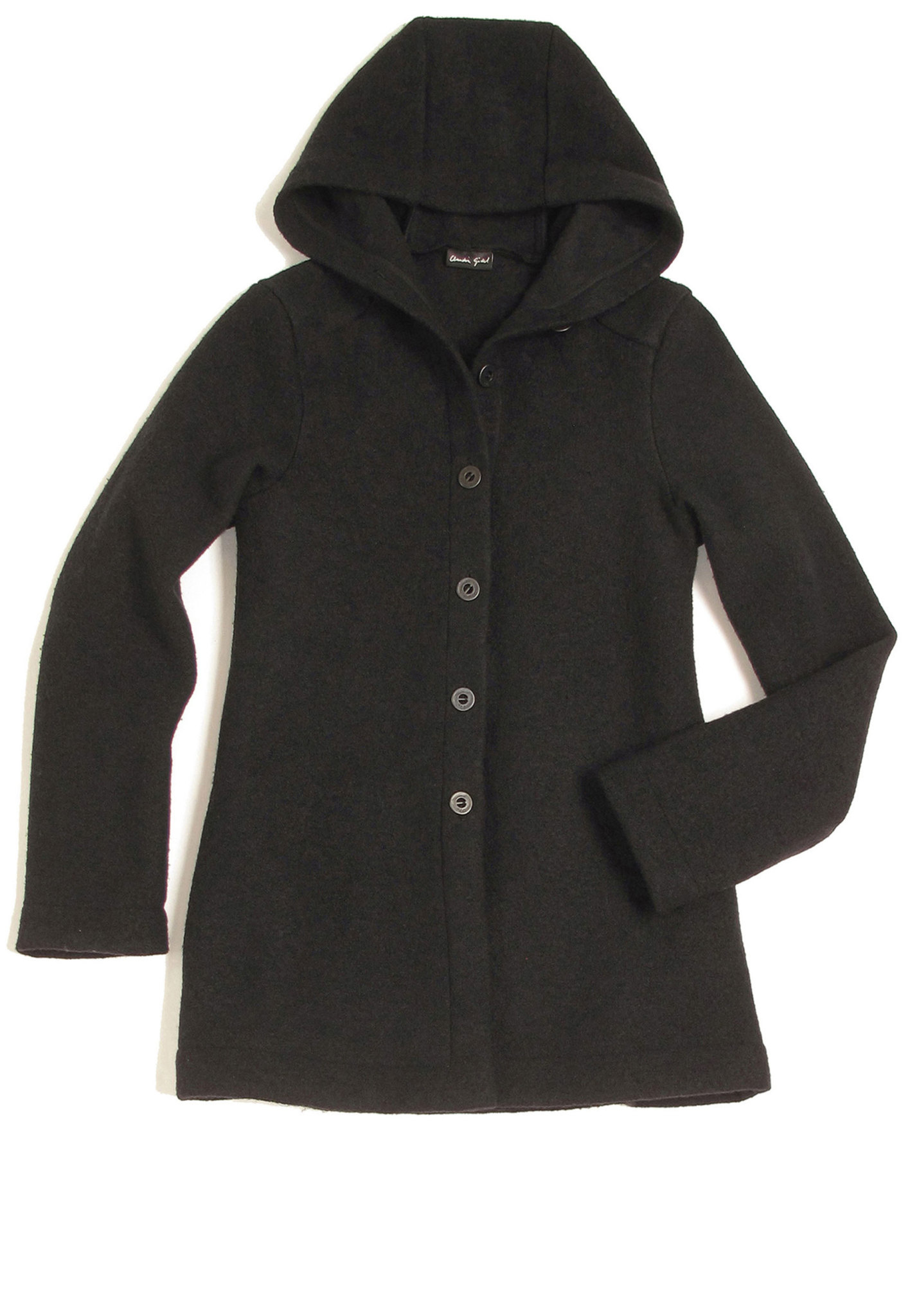 Wollwalk-Jacke in A-Form mit Kapuze, Knopfverschluss und je zwei Taschen innen und aussen aus 100% gewalkter Schurwolle. Die Jacke kann in bestimmte Mantel-Modelle als wärmendes Innenfutter reingeknöpft werden. Falls dies gewünscht ist, bitte bei uns nachfragen, welche Modelle komptibel sind.