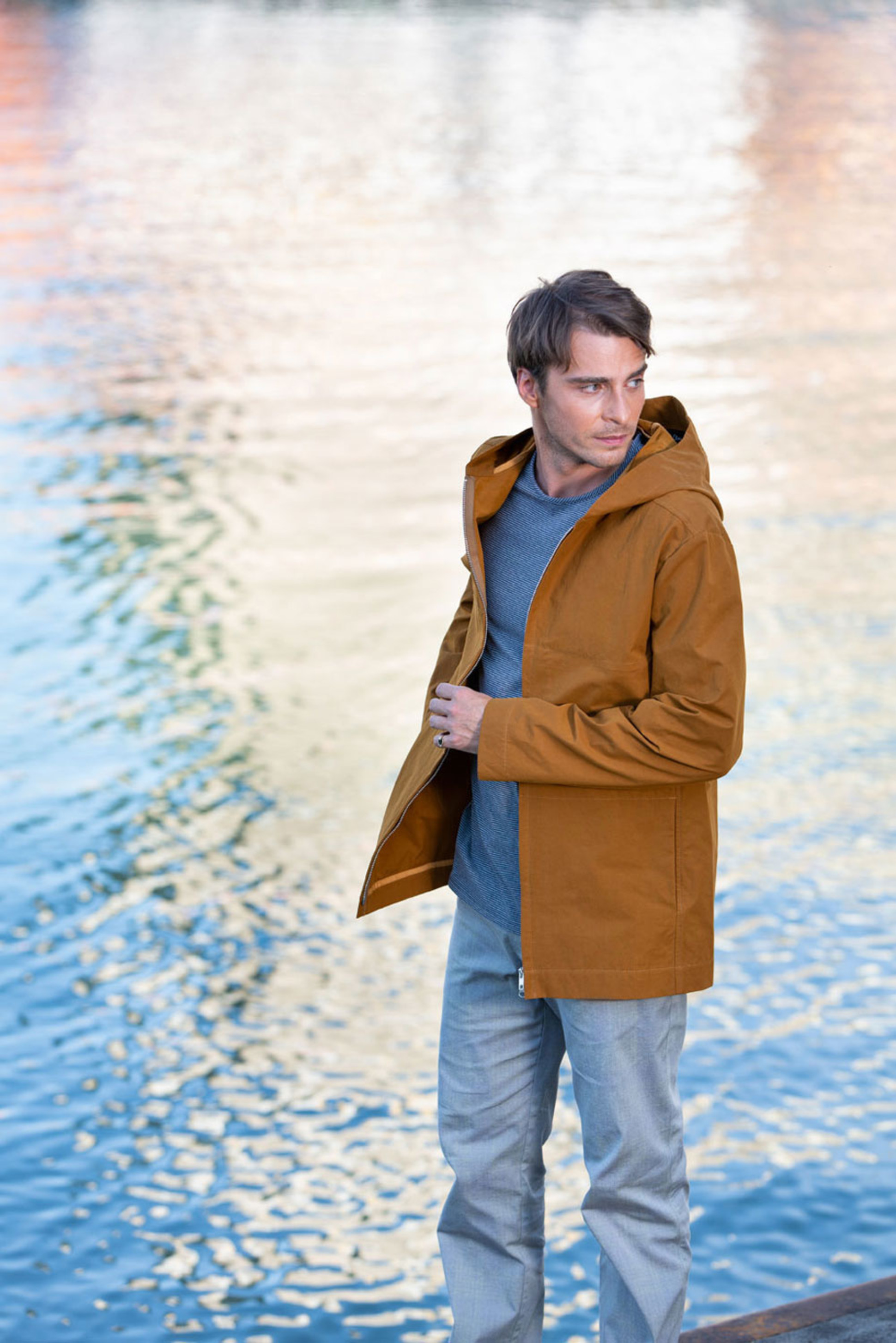 Under the lightweight Fox jacket, our model wears a shirt that is partly made from recycled PET bottles. The striped longsleeve is thus also a statement for environmental protection.