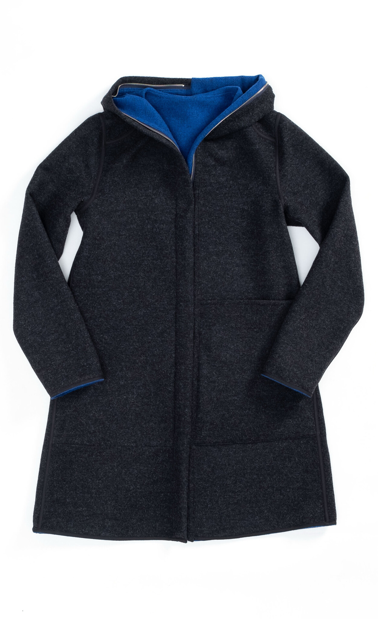 Reversible, long loden coat for women who like to be cosy and warm, with a hood, zip and pockets on both sides. This wonderfully light and warm coat is made from a thoroughly cosy and high-quality double face wool from Germany.