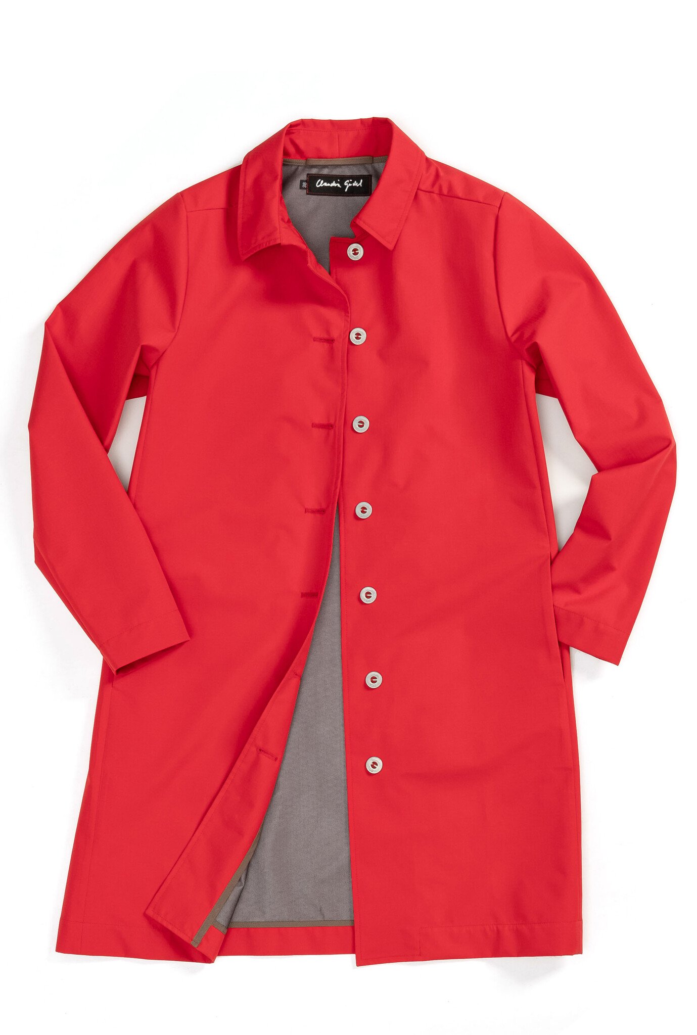 • Der gerade geschnittene, schlichte Regenmantel hat einen flexiblen Kragen, der aufgestellt oder runtergeklappt werden kann, Knopfverschluss und zwei Seitentaschen. Er ist aus dem atmungsaktiven und beschichteten Funktionsmaterial vom Schweizer Textilhersteller Rotofil, welches uns Schutz vor Wind und Wasser gewährt.