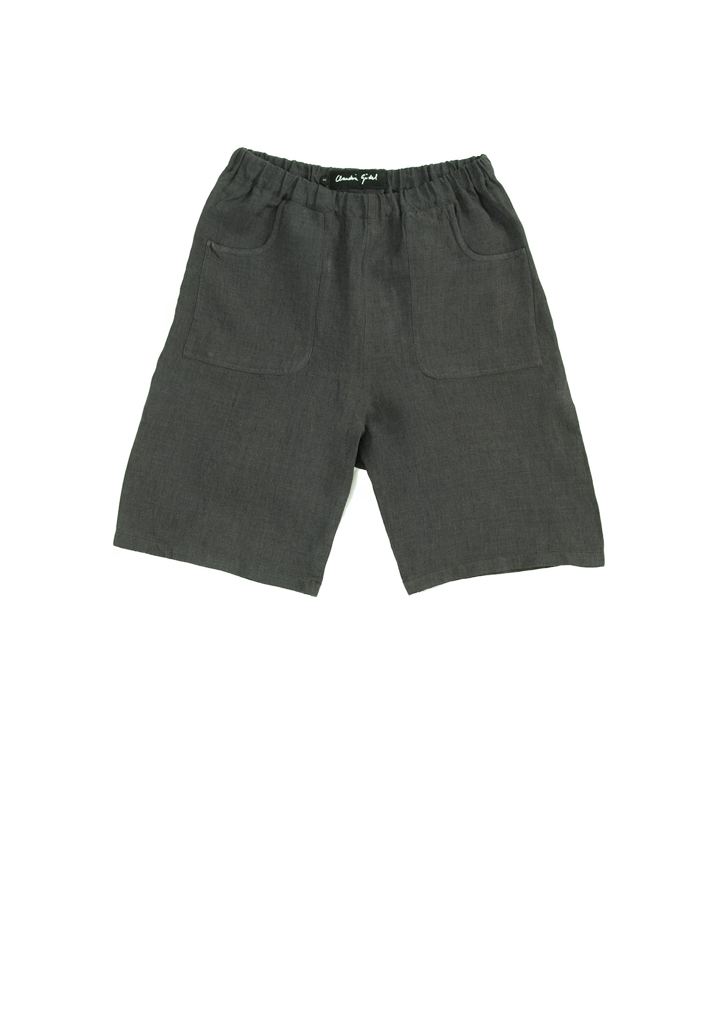 Short, airy, lightweight unisex summer trousers with a comfortable elasticated waistband and two patch pockets at the front and back, made from a wonderfully vibrant and richly textured linen fabric. There are matching jackets for men and women.