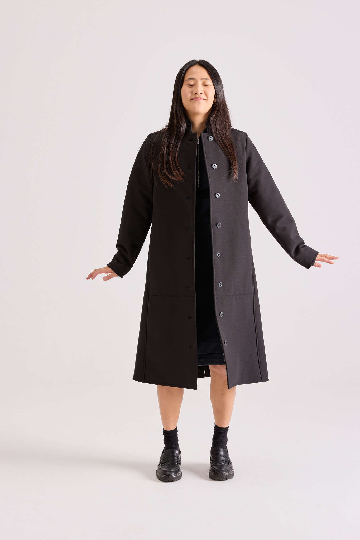 • Long, straight-cut and buttoned SoftShell coat made of a functional material from Rotofil developed especially for us, with cosy faux fur on the inside and a wind- and water-repellent fabric layer on the outside. With a stand-up collar, a rear walking slit, two side pockets in the seam and two inside pockets, this practical coat offers a cool and elegant look at the same time.
