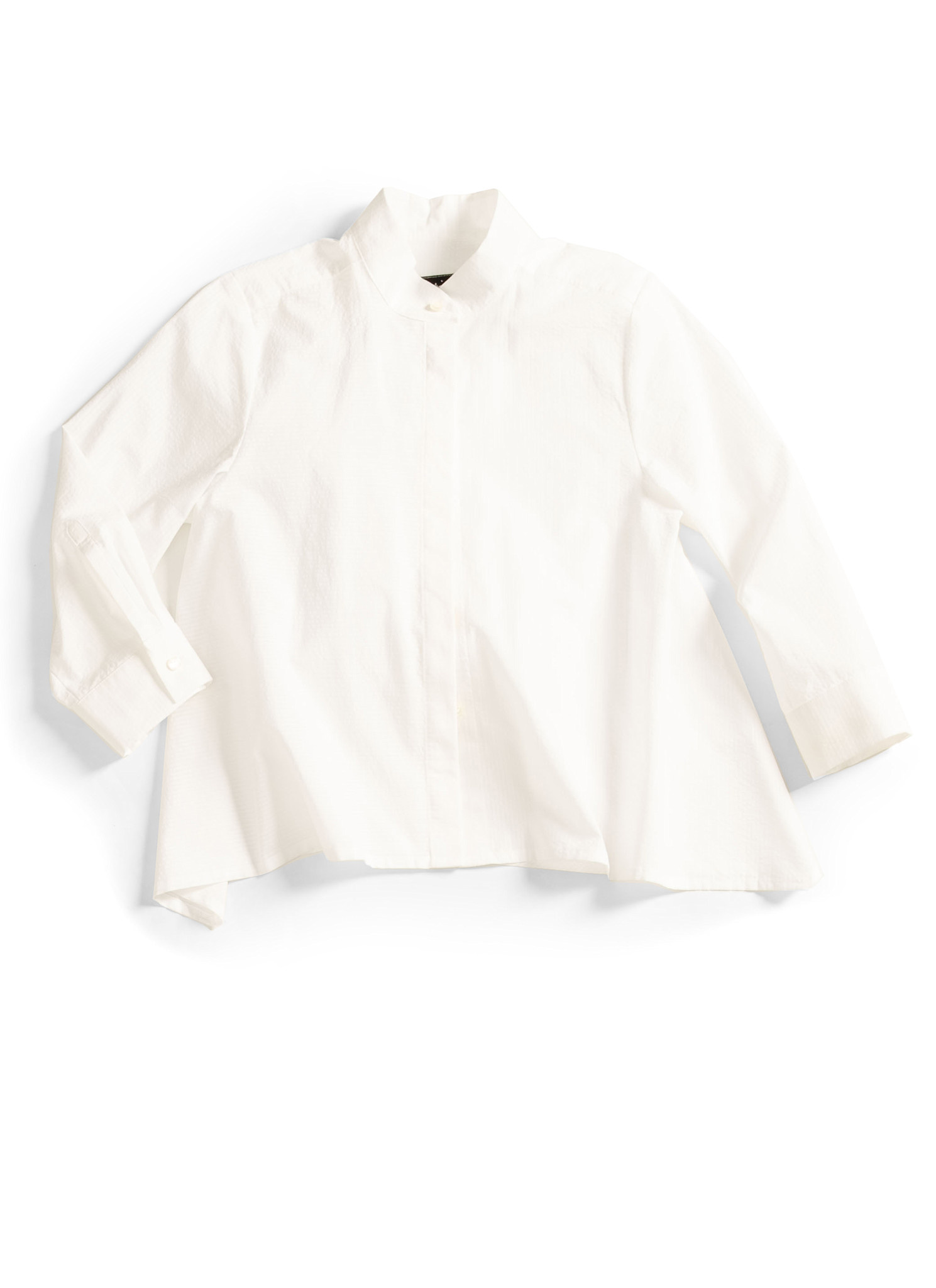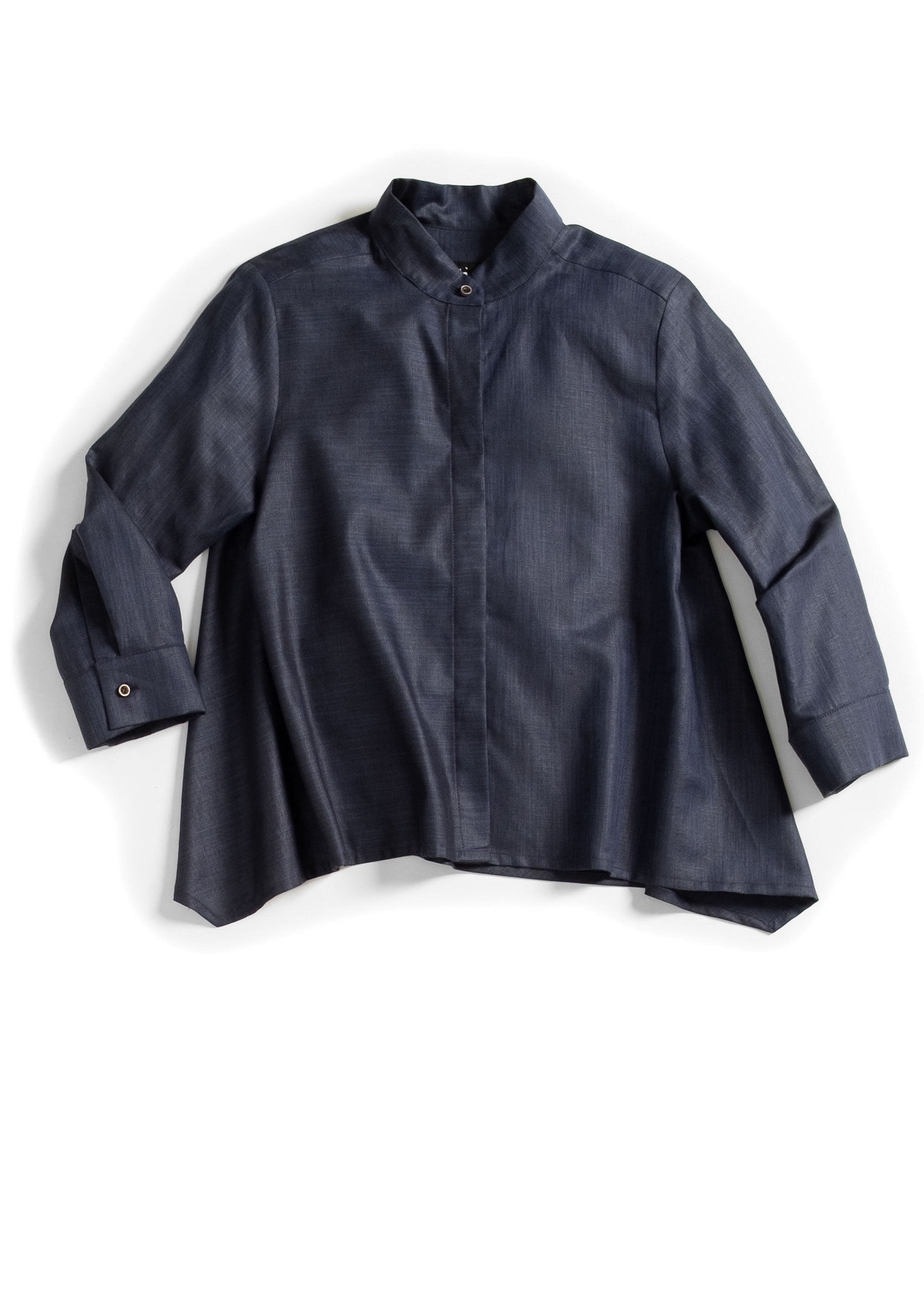 Short, O-shaped blouse without side seams, with stand-up collar, concealed button fastening and 3/4 sleeves with cuffs. This slightly different blouse is cut from a quarter circle and made from a crisp, yet fine and robust linen-cotton fabric from an Austrian specialist in workwear. Solid and easy to care for, the blouse is ideal for everyday use.