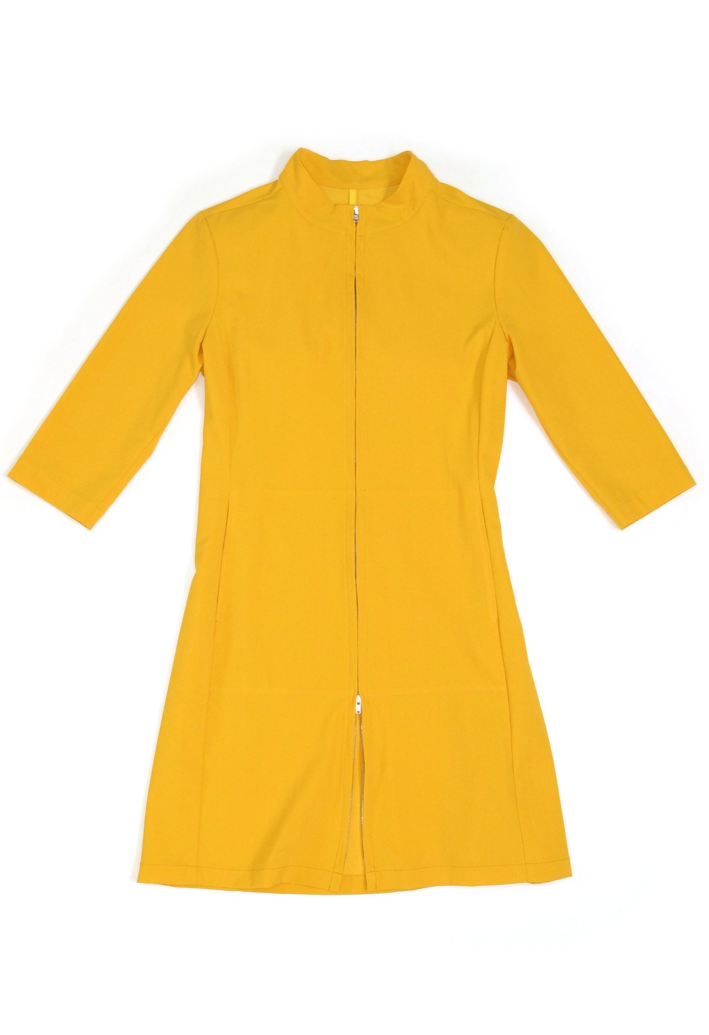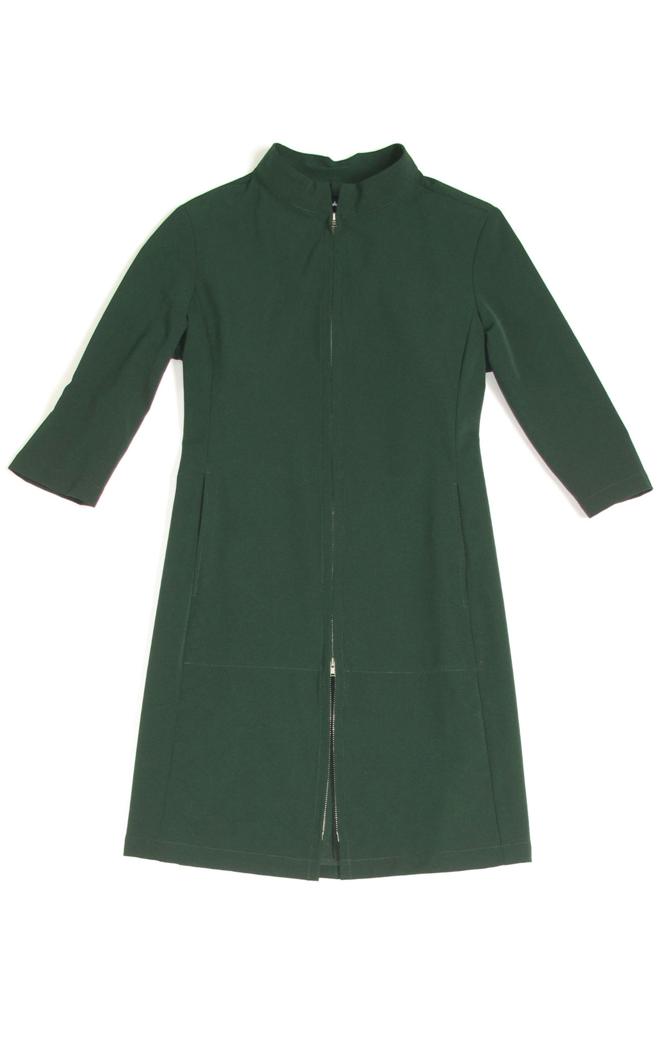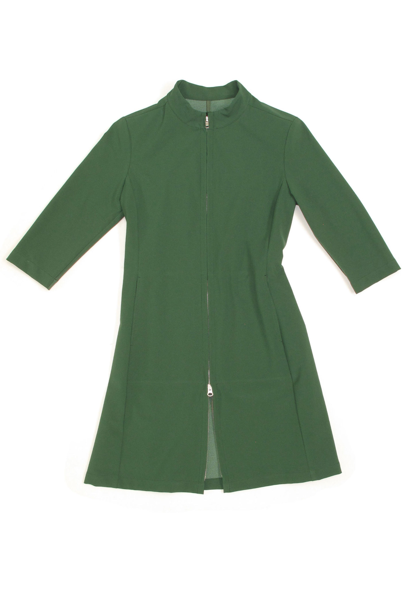 Sporty elegant zipper dress with 3/4 sleeves, separable zipper, two seam pockets and stand-up collar. The short dress, which also serves as a summer coat, is made of the wind- and water-repellent dryskin functional material from Schoeller (CH) and is therefore breathable, easy-care and versatile.
