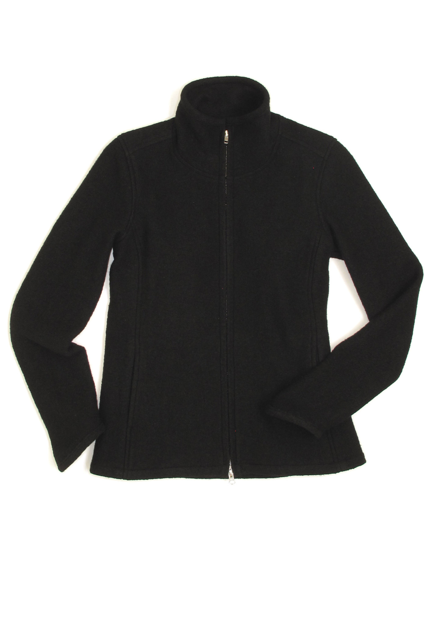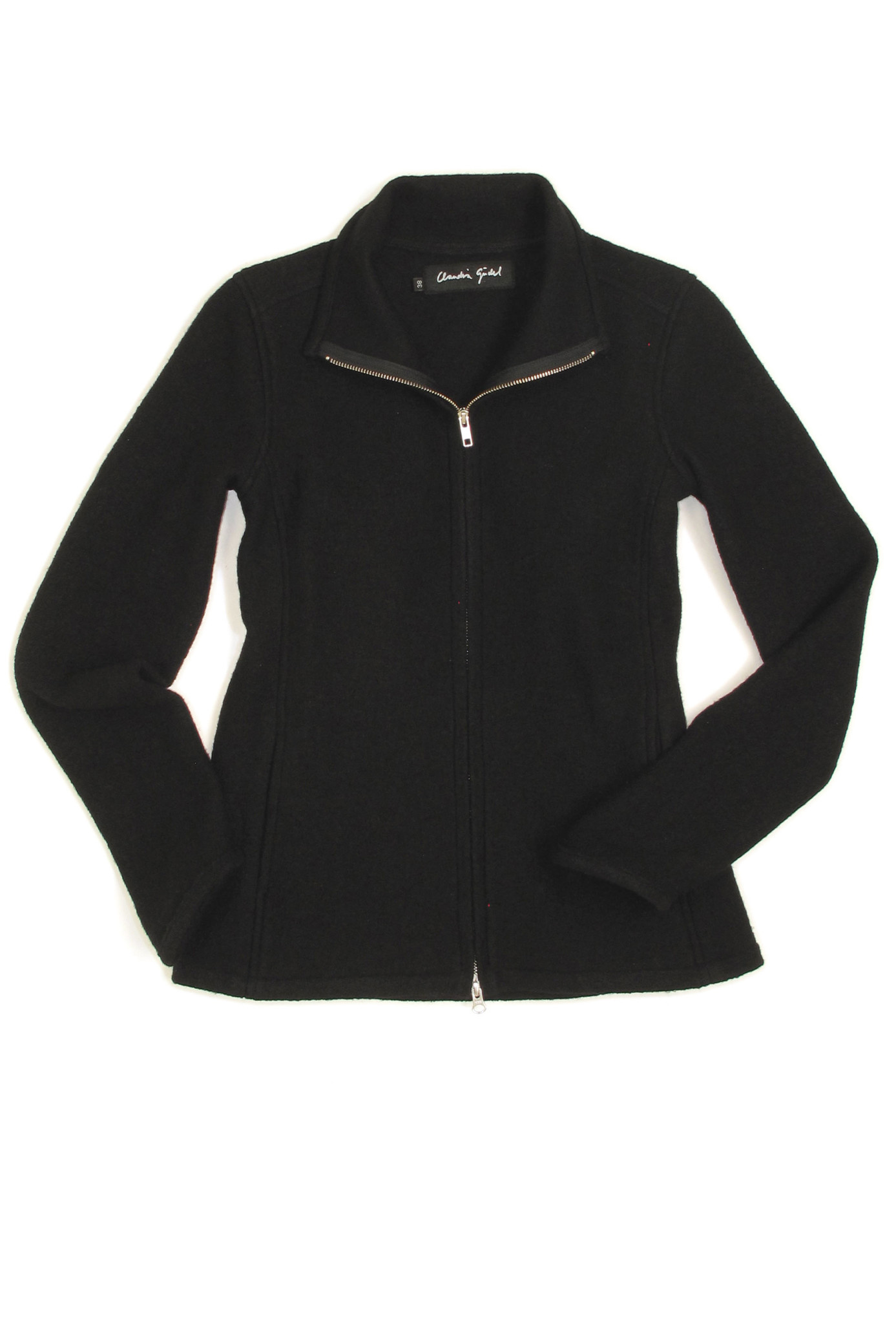 • Waisted wool jacket with high stand-up collar, divisible zipper at the front, two seam and inside pockets and bevelled trims at the sleeves made of 100% boiled merino wool.