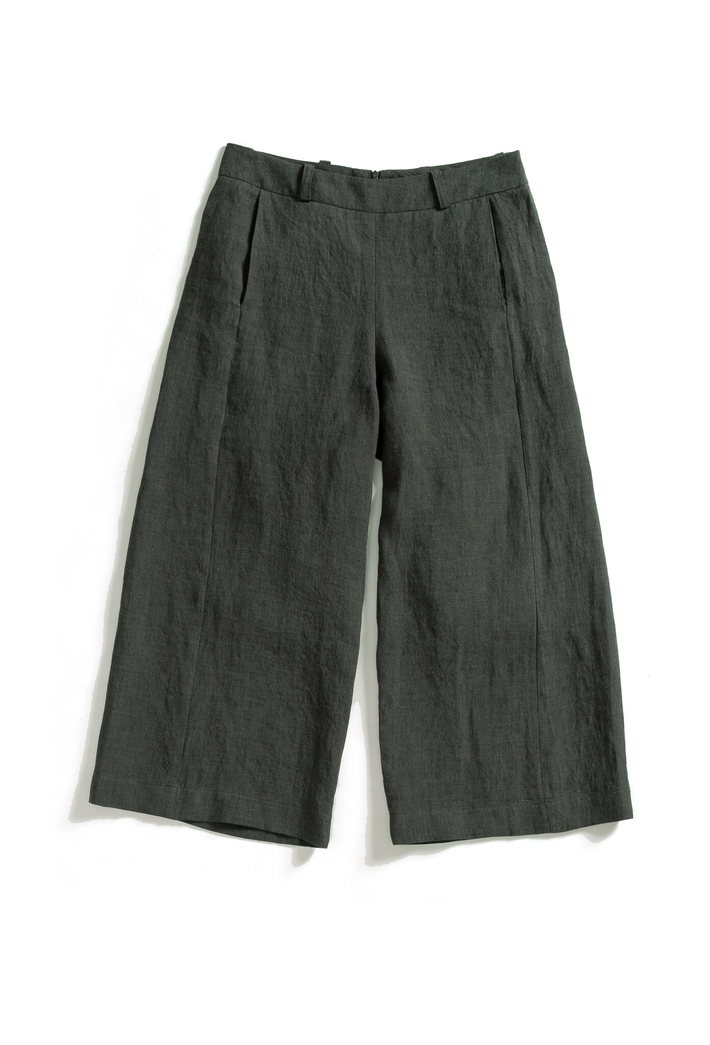 The wide 3-track culottes without side seams, but with two pockets at the back and in the front seams, are made from a wonderfully lively and richly textured linen fabric. There are matching jackets available.