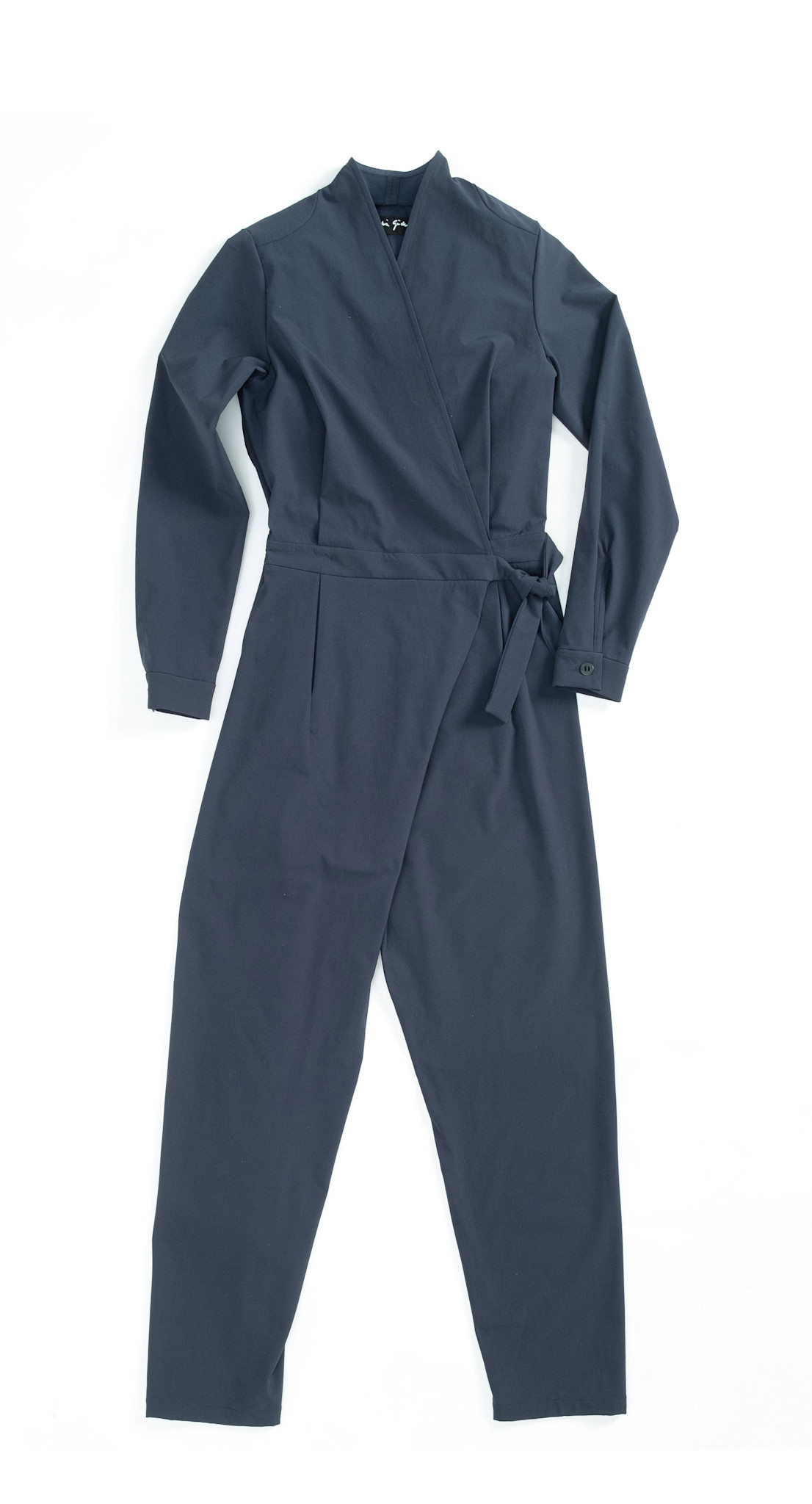 • An elegant wrap overall made from the 4-way stretch and breathable DrySkin functional material from Schoeller. The easy-care material, easy entry and four integrated pockets make this exclusive and beautiful piece an absolutely practical and adaptable suit that can stand on its own.